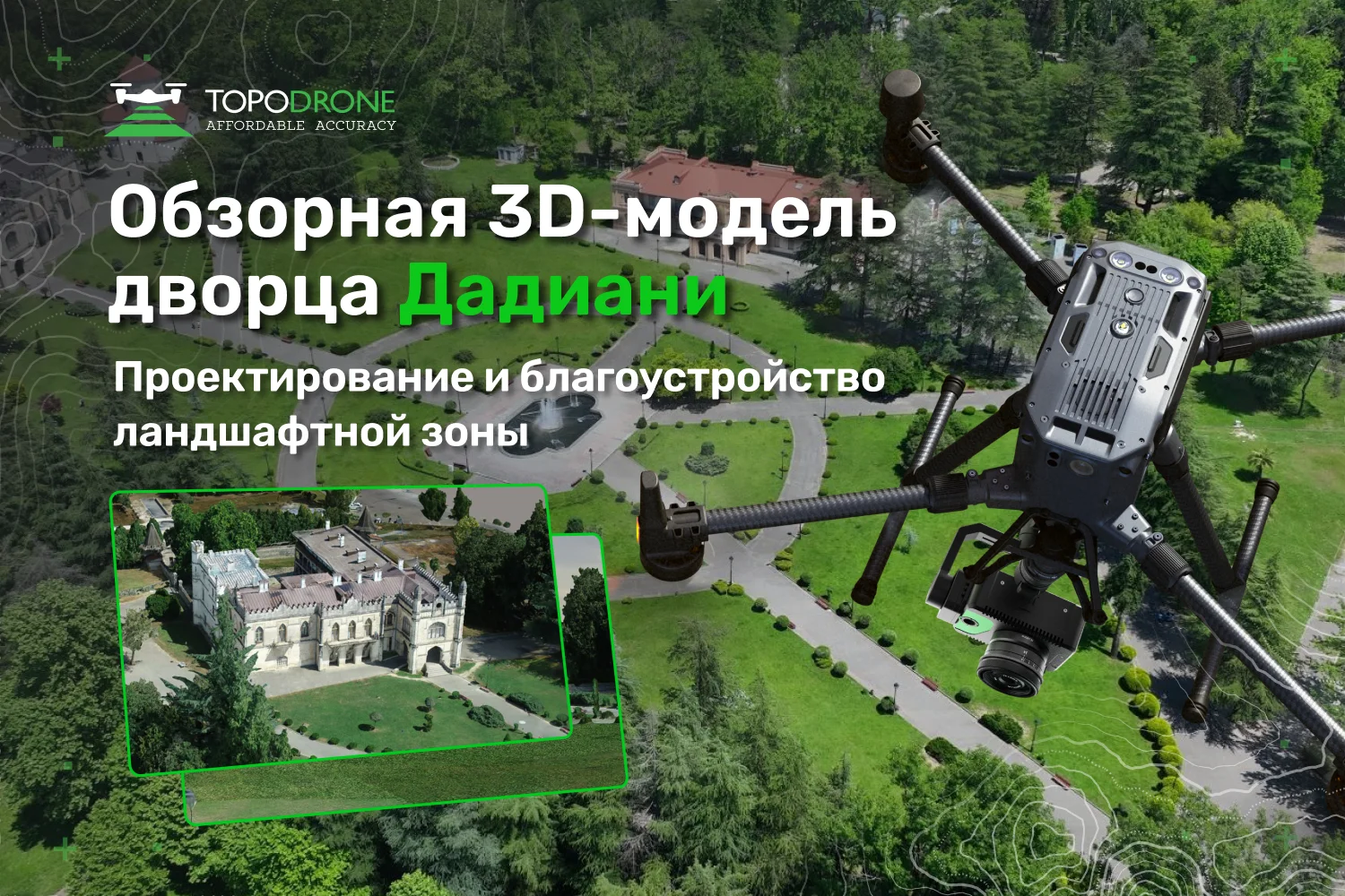 Команда TOPODRONE выполнила первичную обзорную фотограмметрическую съемку территории дворца Дадиани и прилегающего ботанического сада с использованием промышленного беспилотного комплекса DJI Matrice 350 с камерой TOPODRONE P24 и модулем PPK.