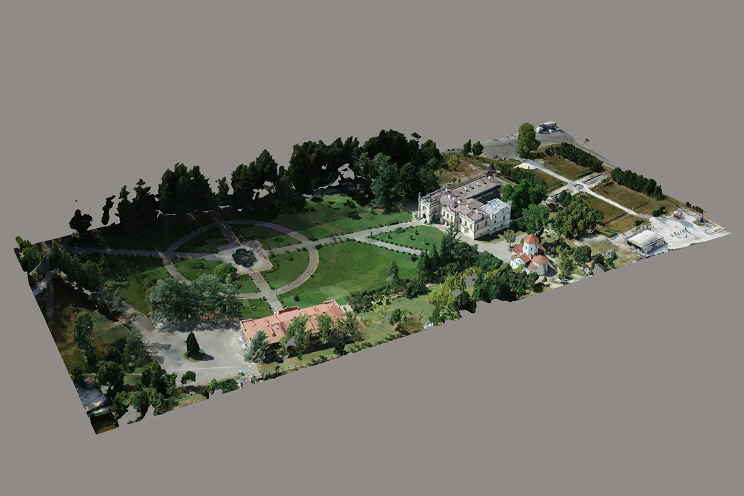 Даже на обзорном уровне 3D-модель предоставляет полное пространственное понимание территории дворца Дадиани, позволяя специалистам оптимизировать ландшафтное проектирование и принимать обоснованные решения по развитию и уходу за историко-культурным садом.