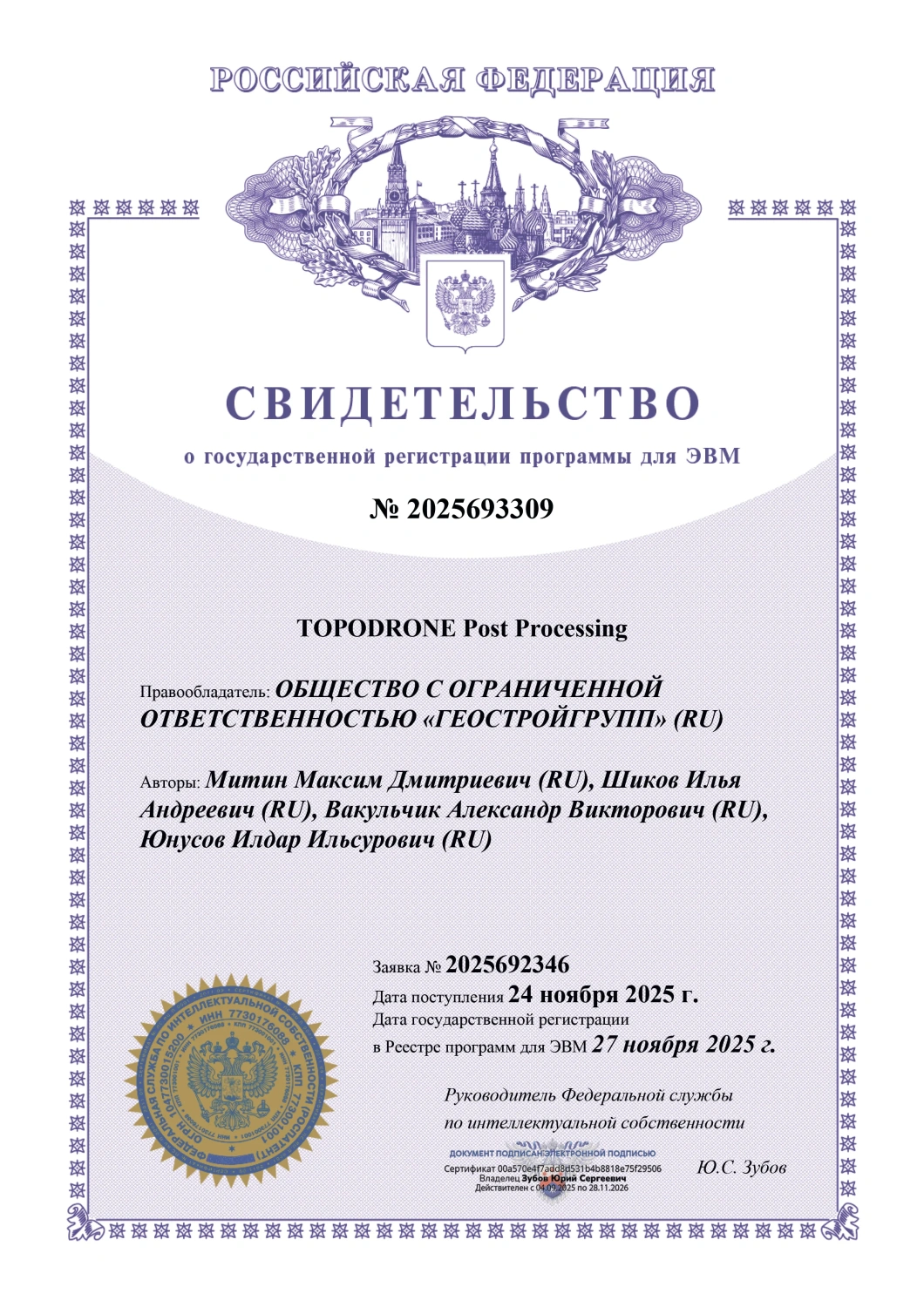 Программа TOPODRONE Post Processing успешно прошла проверку в Роспатенте и была внесена в реестр программ для ЭВМ. Мы получили официальное свидетельство, подтверждающее уникальность разработанных алгоритмов и закрепляющее исключительные права на программный продукт.